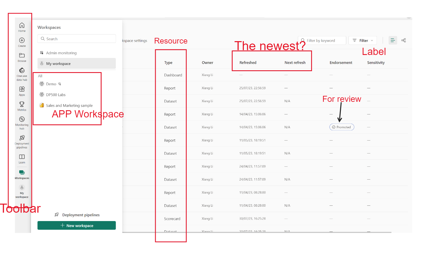 b. It holds my workspace (highest private) and can also create APP workspaces to group and share resources under our account, each workspace can have datasets, reports, dashboards, dataflows, datamarts (premium tier: support Power Query Editor + SQL/Visual query + Report Building, provide Desktop experience), and scoreboards.